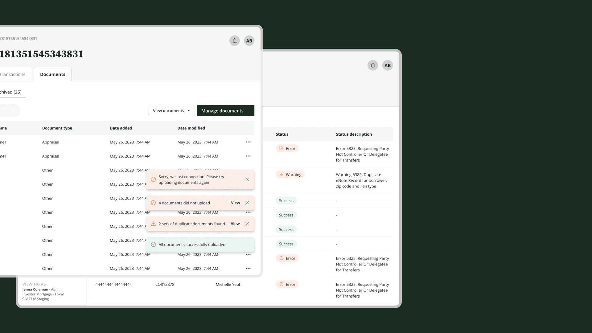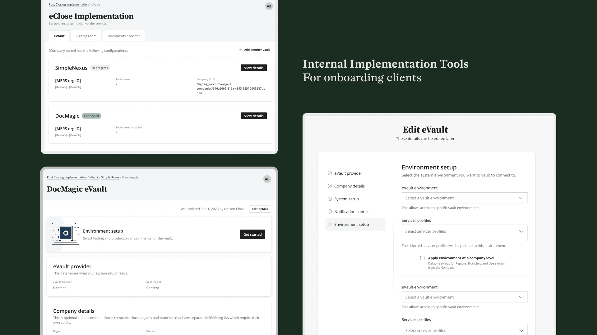 As the lead designer, I designed the eVault platform to (1) operate at enterprise volumes across org types, (2) have a native eSign that connects across the ecosystem, (3) provide audits any time, at any level, (4) pull custom reports and create templates, (5) adapt view to environments: staging, production, org ID, roles and permissions, (6) have internal tooling to onboard clients, (7) pass industry approvals, and (8) embody self-service: a transparent approach to error handling and user agency.